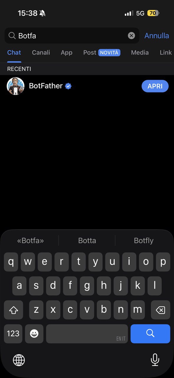 Cerca "BotFather" nella barra di ricerca di Telegram. Assicurati di scegliere il bot con il segno di spunta blu di verifica. Clicca sul risultato e poi su Avvia (o Apri se lo hai già usato).