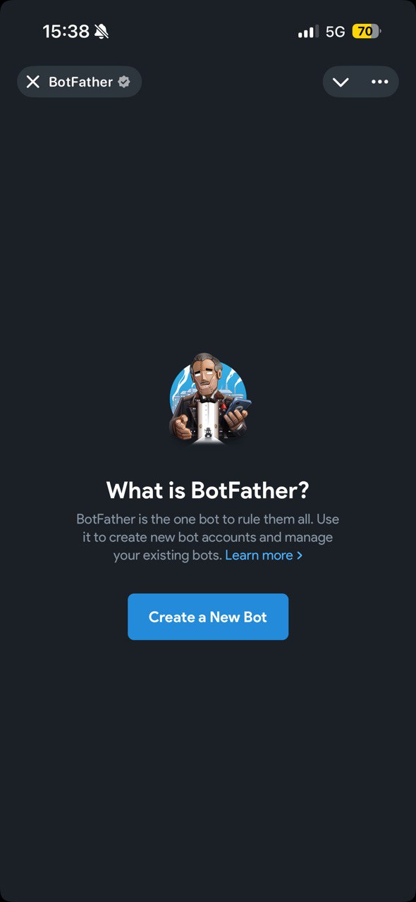 Una volta nella chat con BotFather, clicca su Create a New Bot.