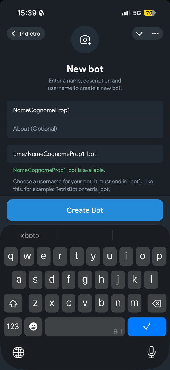 Come username del bot, inserisci: NomeCognomeProp1_bot (ricorda che l'username deve finire obbligatoriamente con "bot")