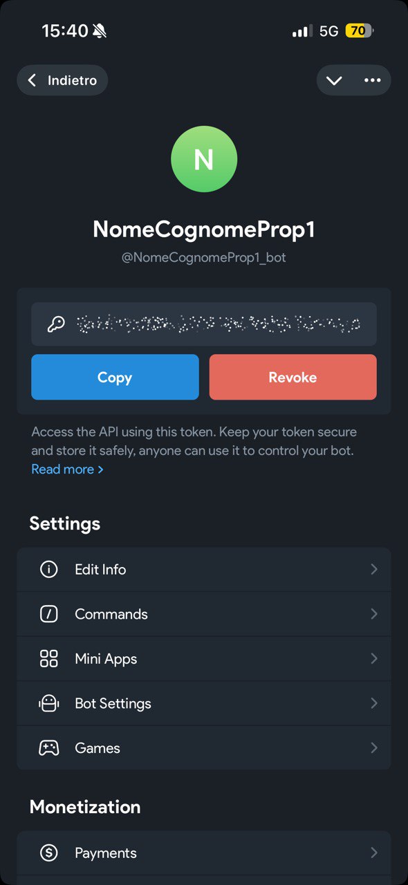 Una volta completato, ricordati di copiare e inviarci anche il Token API di questo secondo bot.