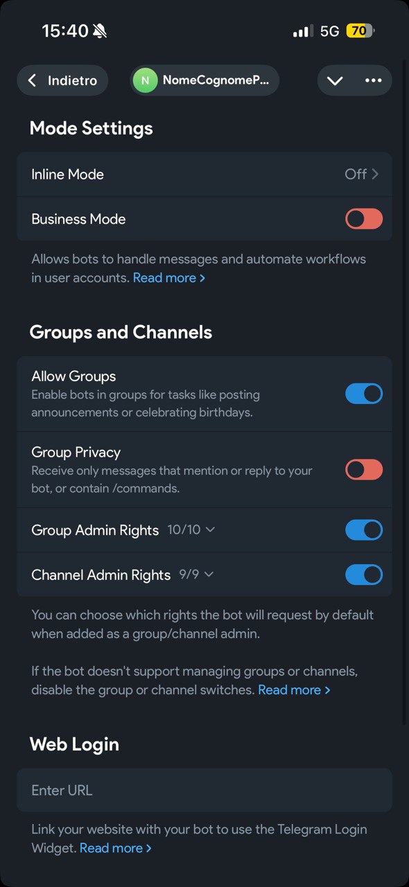 Modifica le impostazioni del bot come segue per garantirne il corretto funzionamento nei gruppi: